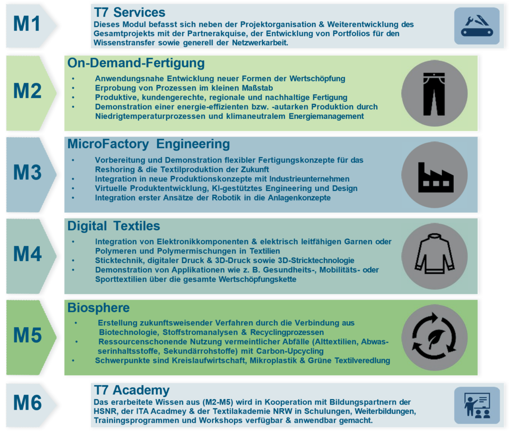 T7 ist ein Projektvorhaben des Forschungsinstituts für Textil und Bekleidung der Hochschule Niederrhein, des Institut für Textiltechnik (ITA) an der RWTH Aachen, des Verbandes der Nordwestdeutschen Textil- und Bekleidungsindustrie sowie des Verbandes der Rheinischen Textil- und Bekleidungsindustrie, mit der Textilakademie NRW sowie der WFMG für die Stadt Mönchengladbach.